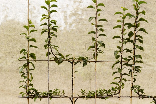 Training apples and pears as espaliers is a space-saving way of growing fruit on a wall or fence. They require little pruning once established and are attractive in blossom and fruit and architectural during winter. Ornamentals such as Pyracantha are sometimes trained as espaliers.